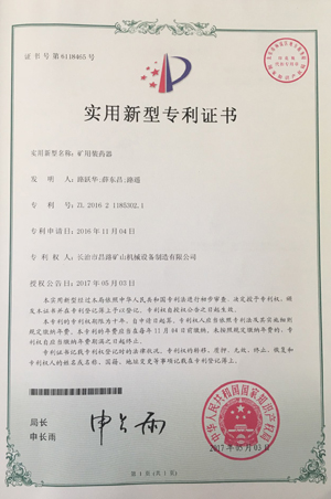 恭賀我公司產(chǎn)品礦用裝藥器于2017年5月3日再次獲得國家專利證書 專利證號:ZL 2016 2 1185302.1
